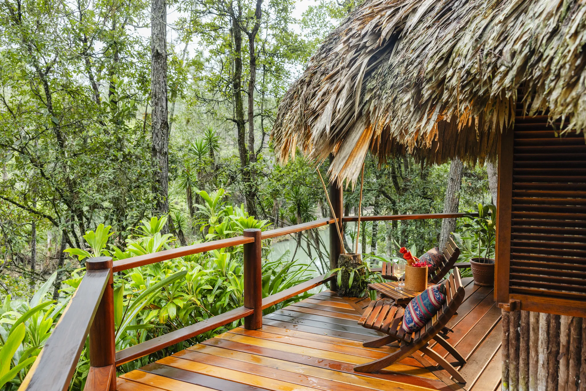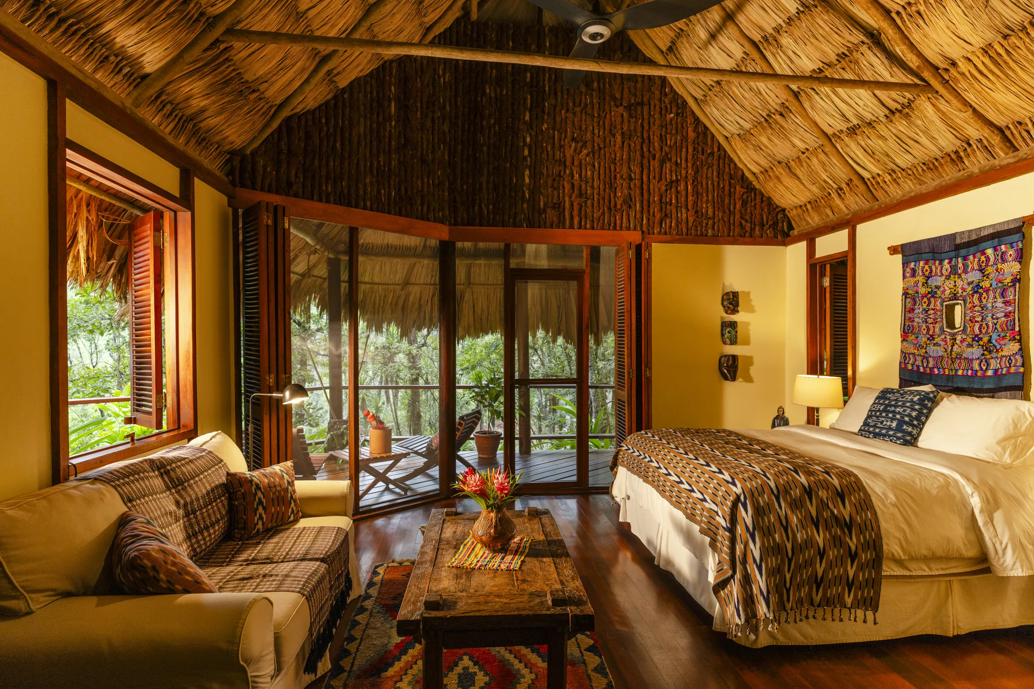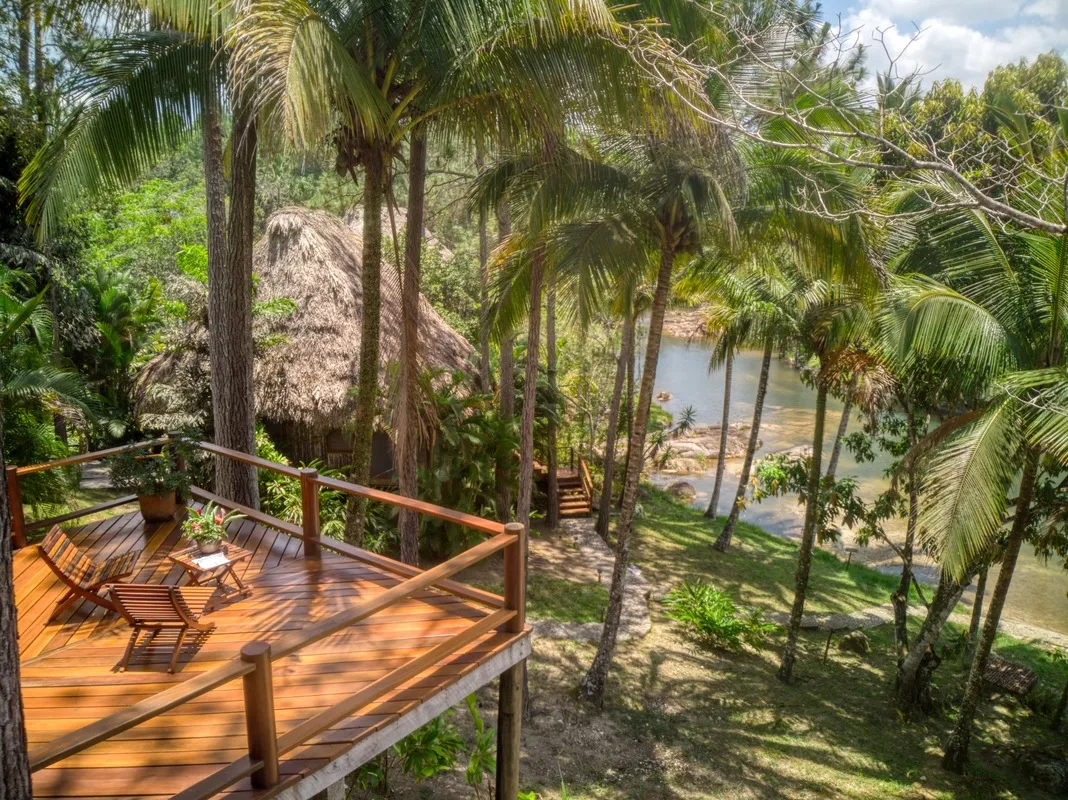 All Riverfront Cabañas at Blancaneaux Lodge feature an expansive deck ensuring a spectacular view of the Privassion River. Our Belize luxury accommodations are elegantly themed with native art and local textiles, and offer a queen-size bed and hand-painted tile bathroom. *Note on floor plan in slide show – that each of these cabanas layouts could vary but all provide outside deck and comfortable indoor seating area.