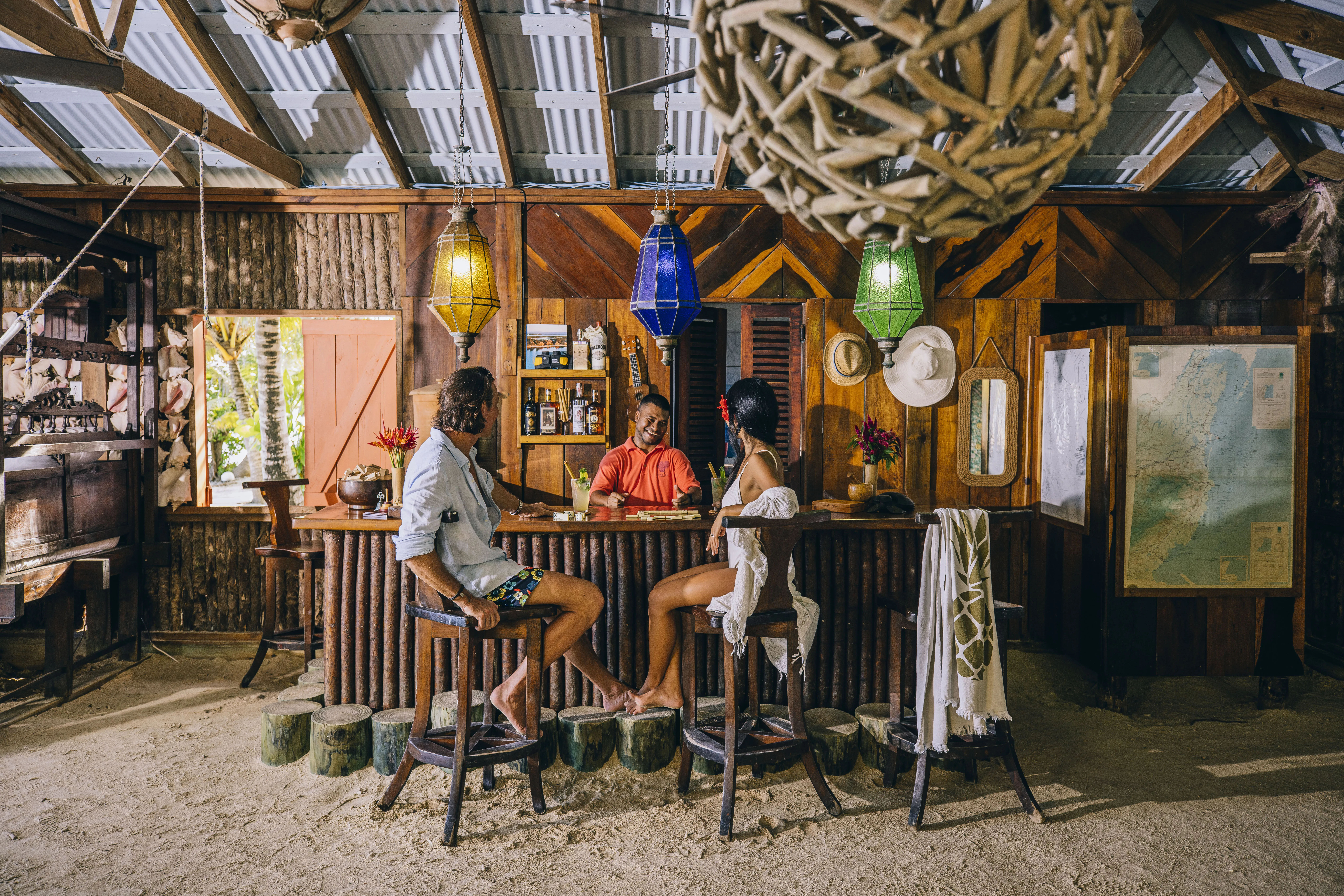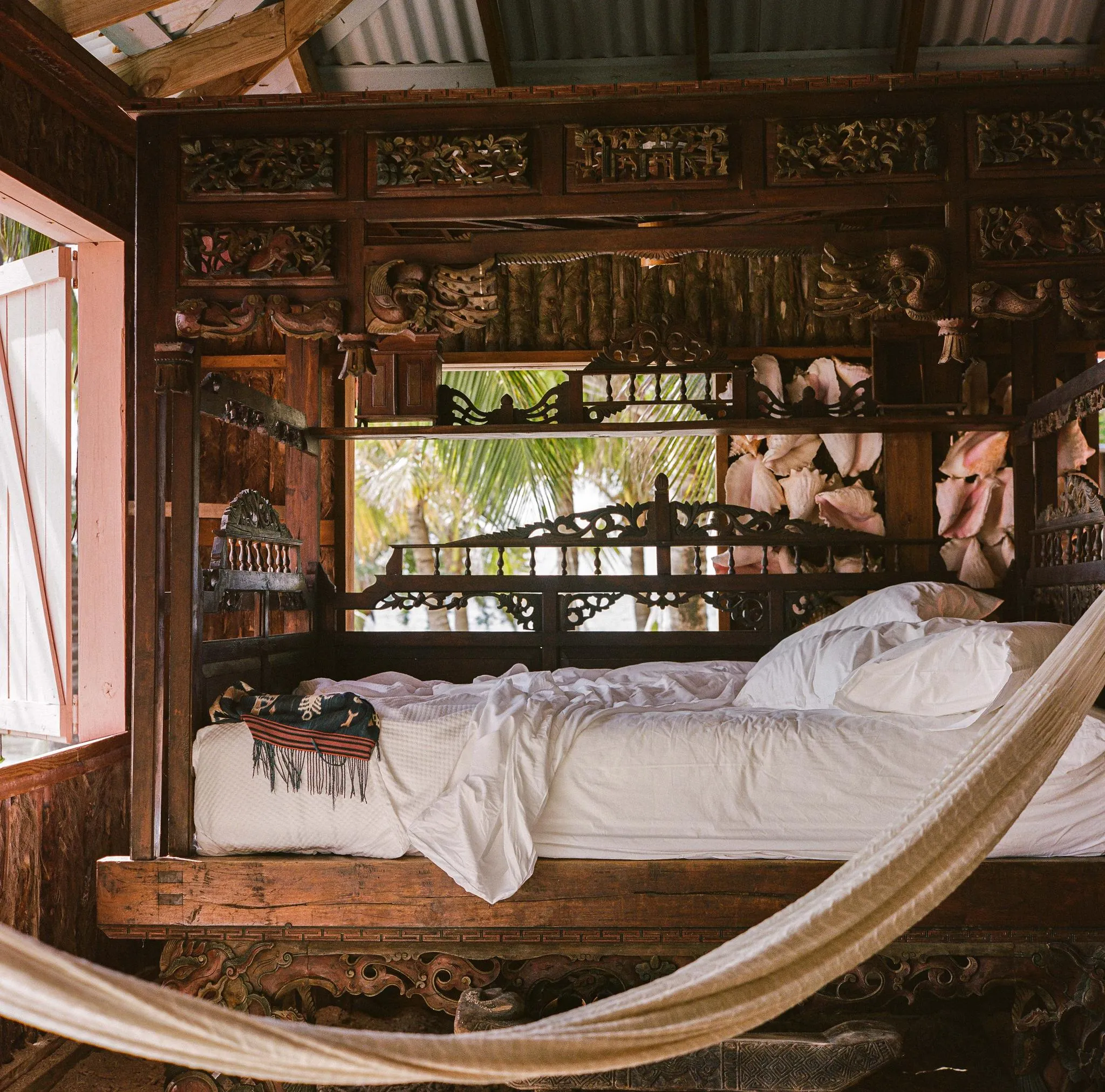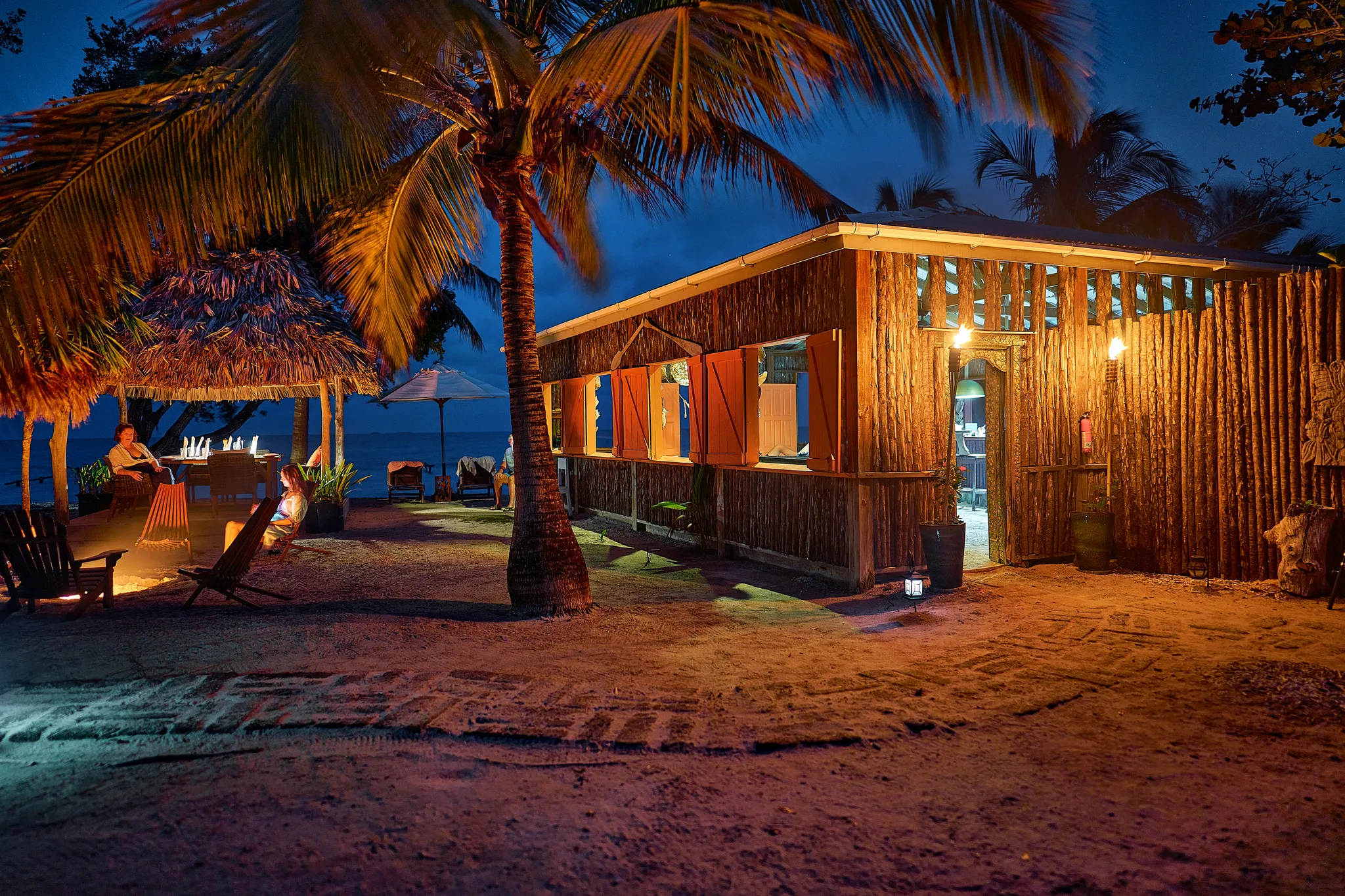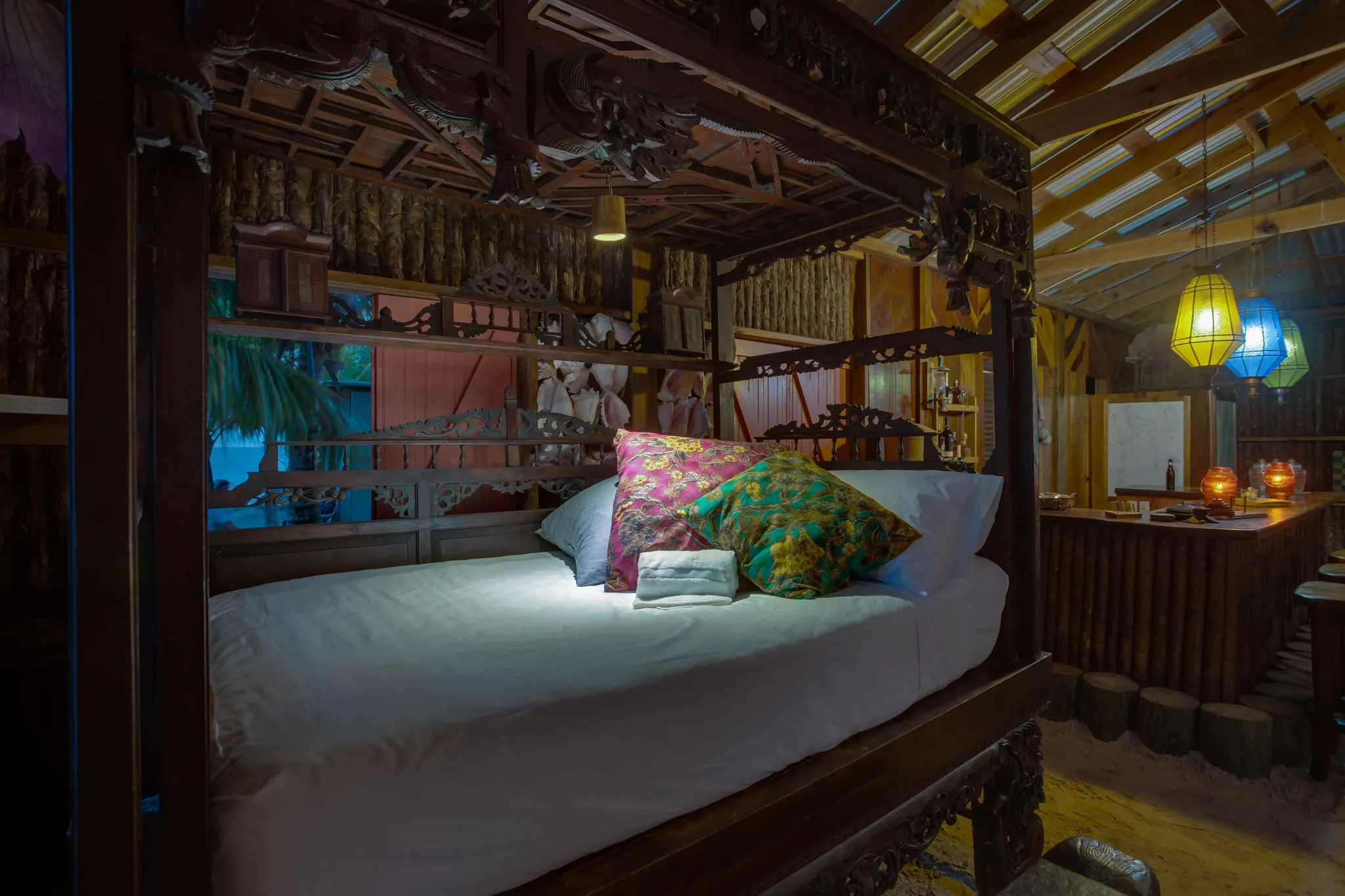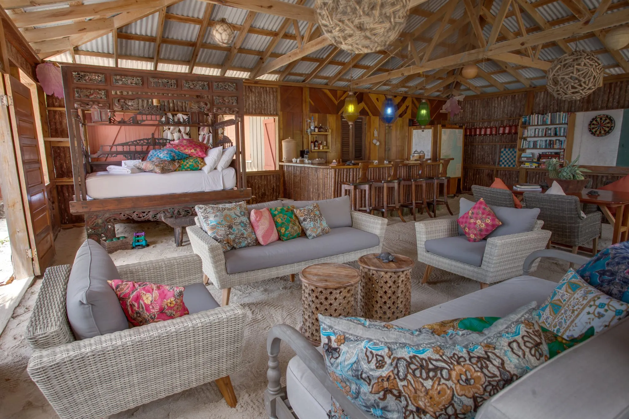 A charming, sand floor, indoor/outdoor living room space with amenities including a full bar, music system, half bathroom, kitchen, dining table, board games, dart board and more this space for celebration or family meals. Additionally there is a full-size day bed for napping or an optional additional overnight stay accommodation.