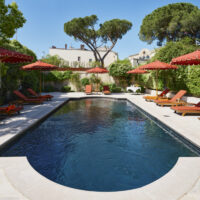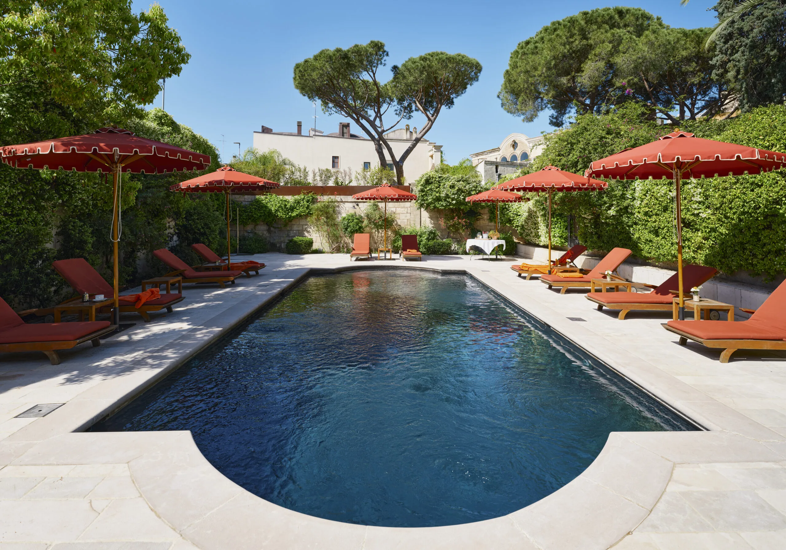 Suite bedroom with a tile floor, living area and windows Sun shining through arched gateways Family Bar interior with bar and tables Inside the Cinecitta Bar Painted, domed ceiling in suite nine Looking over Matera at dusk Columns at Hera Temple Arched gate at dusk Bed and seating area in suite four Outdoor dining area on a patio outside of suite four Bedroom suite with stone walls Masseria at night A film plays in the Salon Cinema Pool and garden Making a pizza in the eat-in kitchen A dining table in the garden at night
