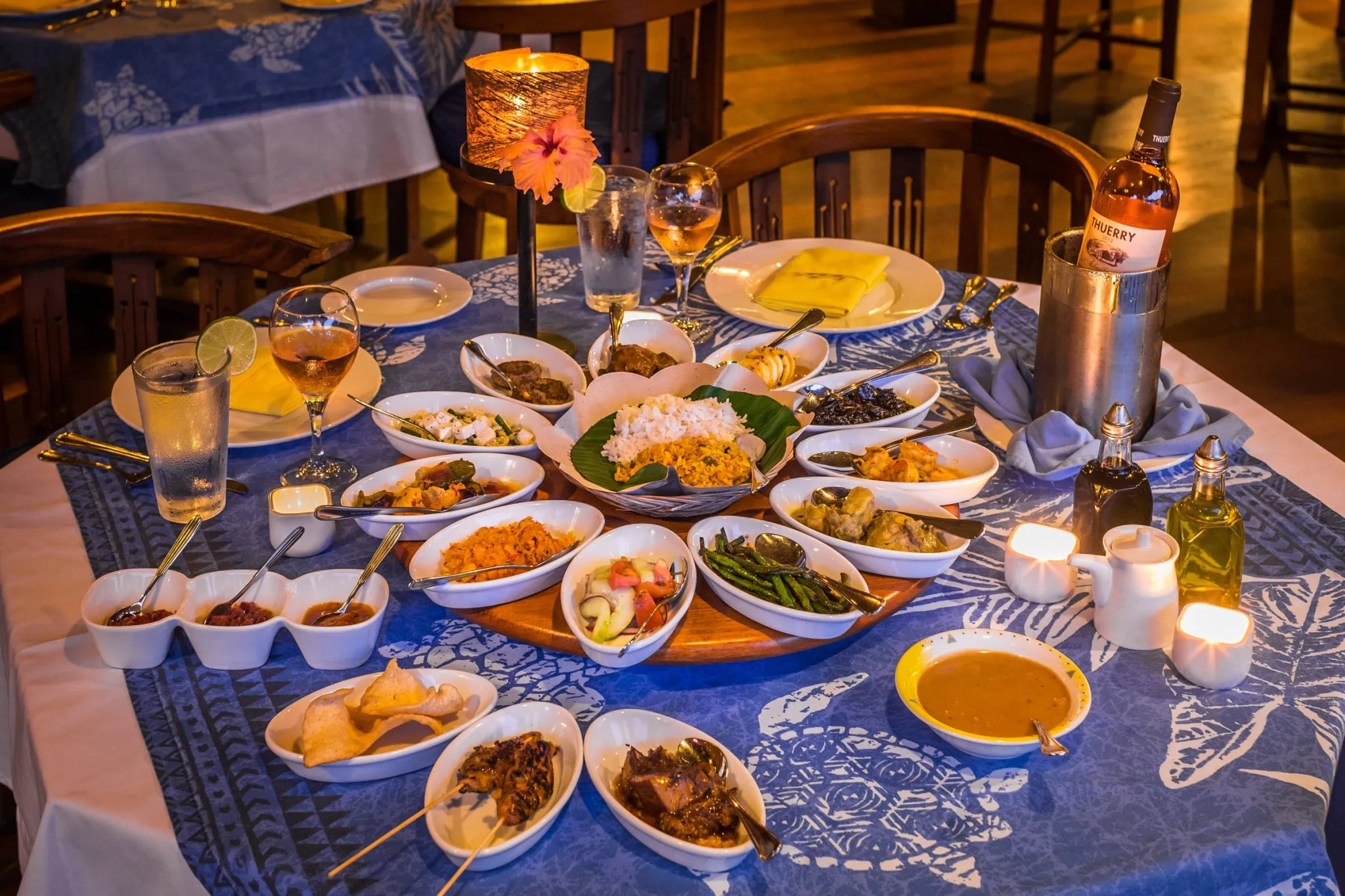 Our changing daily menu offers such dishes as ceviche and gazpacho, fish cooked in a sea-salt crust, and a selection of pizzas made to order in our wood-burning oven. On Monday and Thursday evenings a traditional Dutch Indonesian Rijsttafel dinner is served (as pictured above). The Mare offers a relaxed dining experience beneath the towering vaulted thatch roof, with incredible views out to sea.