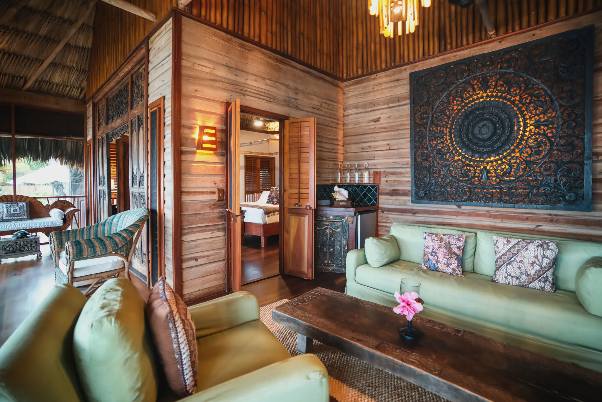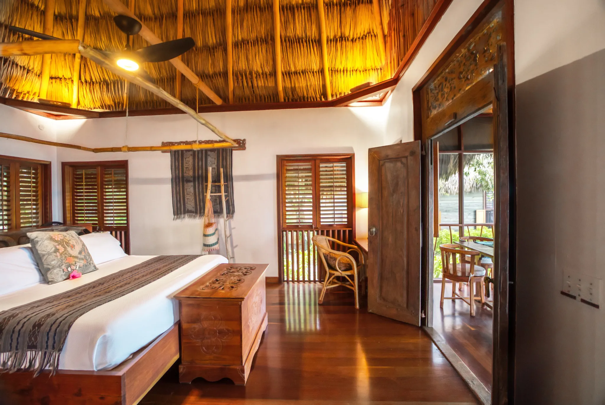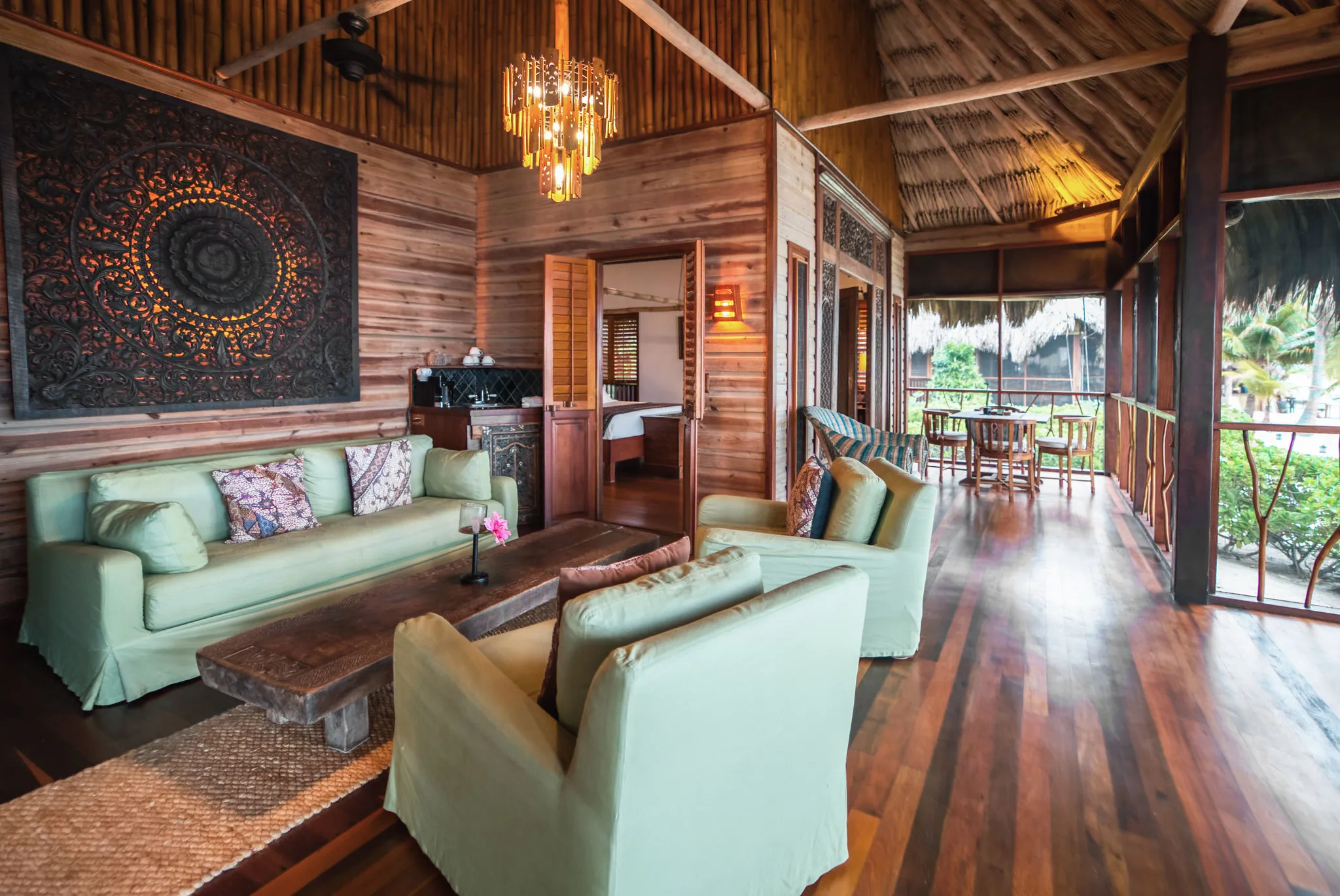 Nestled in our lush gardens and a few paces from the Caribbean Sea, these 2-air conditioned bedroom/2 en-suite bath villas provide luxurious proportions with a living room, separated seating areas, and an extended screened porch. Each villa at our Belize luxury beach hideaway is surrounded by a private walled garden with an outdoor shower. All rooms feature Balinese hand-carved doors and décor, ceiling fans, and thatched roofs that naturally cool the villas. These dwellings are most suitable for families or couples traveling together. Also, be sure to check out our spacious 2-bedroom Seafront Villas at Turtle Inn which provide luxurious proportions just a few steps from the Caribbean Sea.