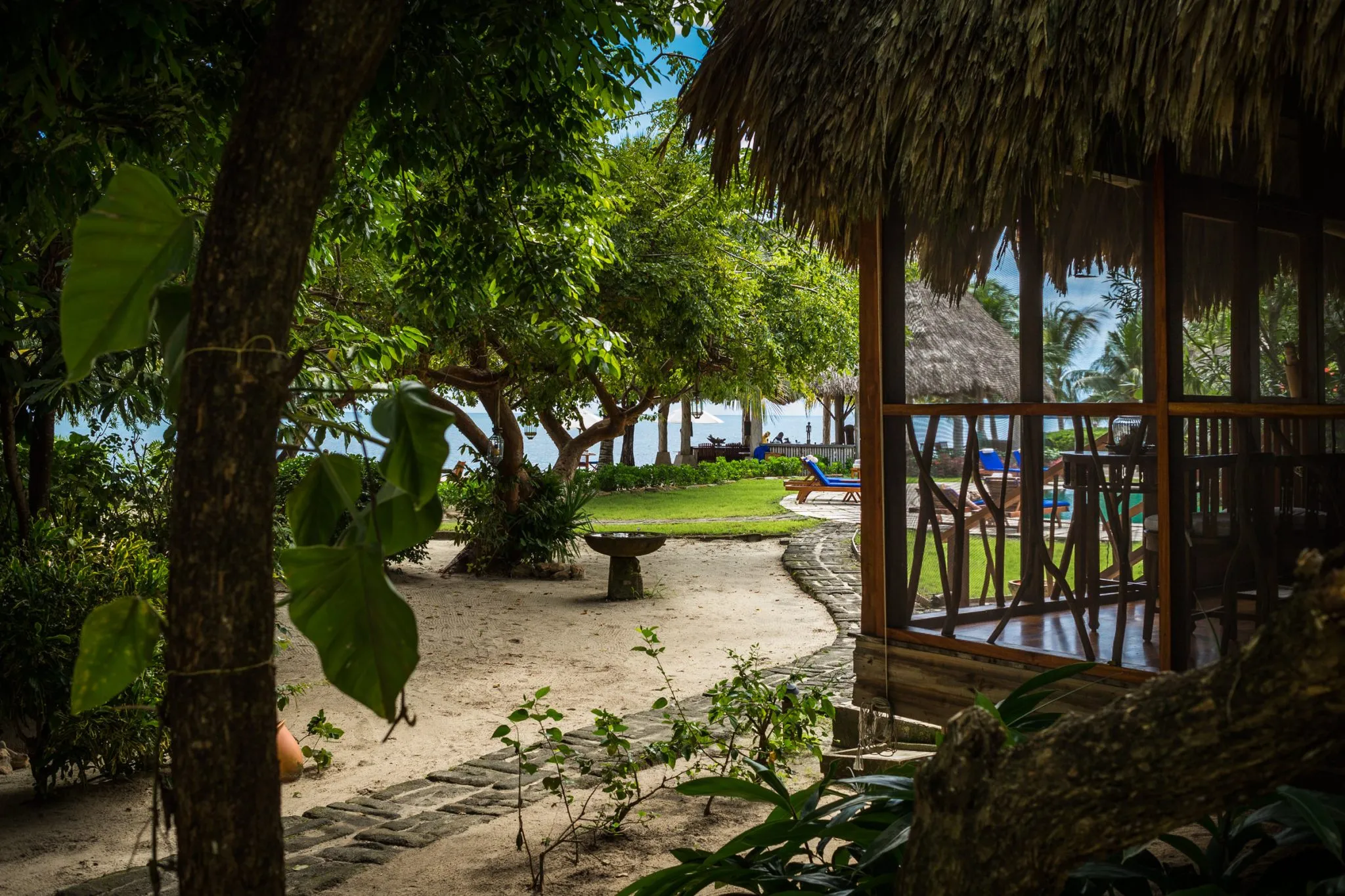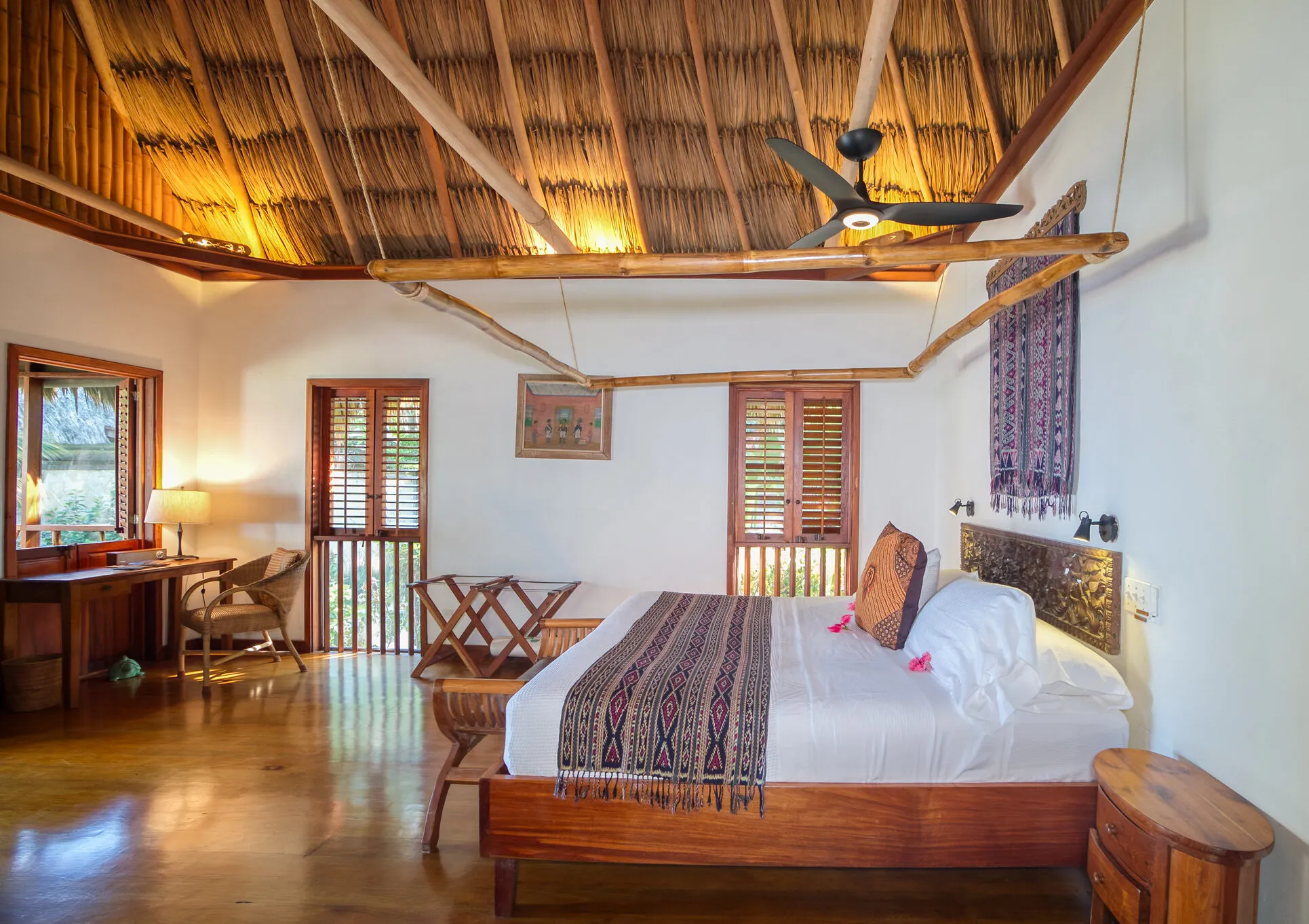 Each Poolside Cottage has a private screened porch, spacious bathroom with a Japanese bath, and a private walled garden with an outdoor shower. All our luxury Belize hideaway dwellings feature Balinese hand-carved doors and décor. All rooms feature Balinese hand-carved doors and décor, and ceiling fans.