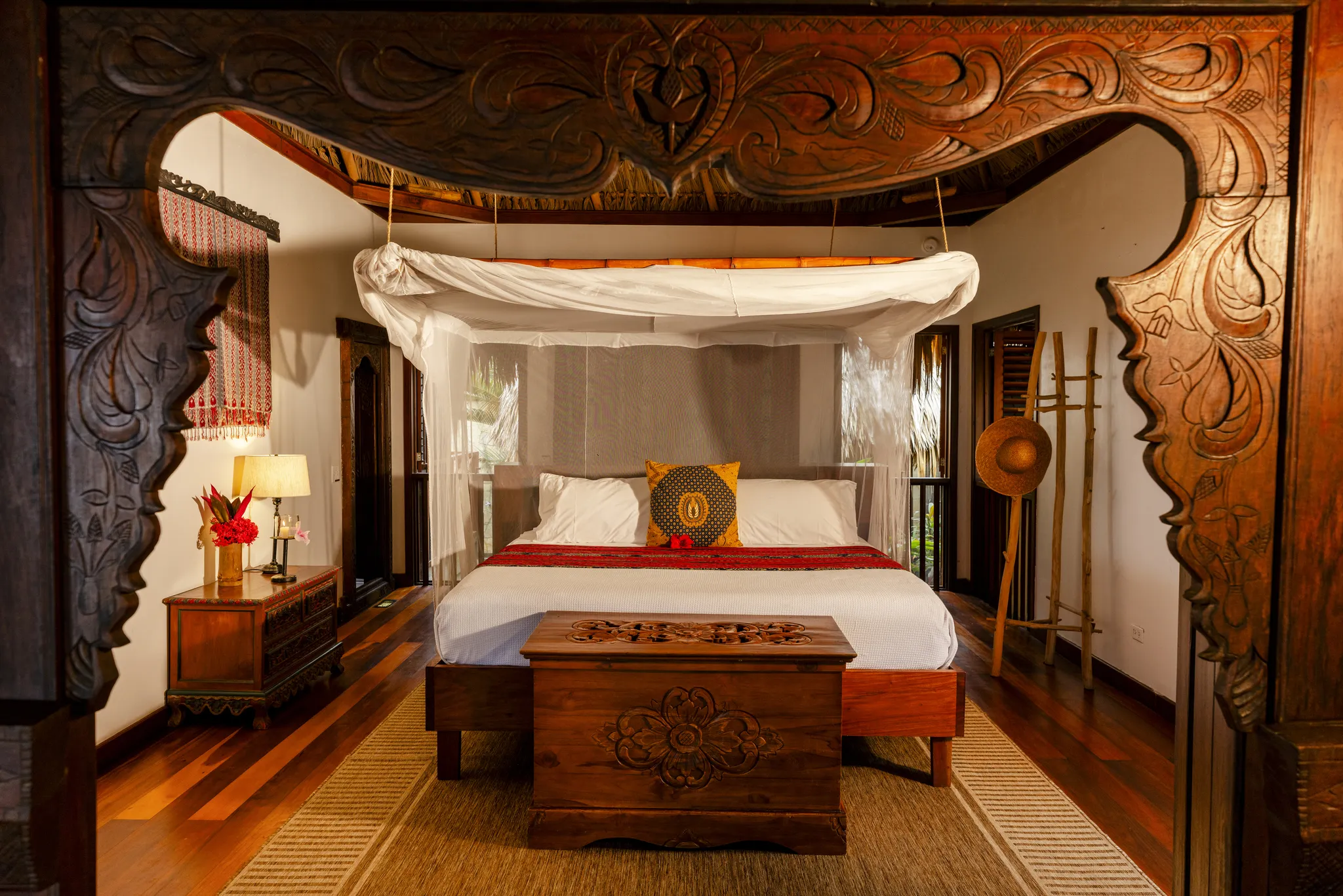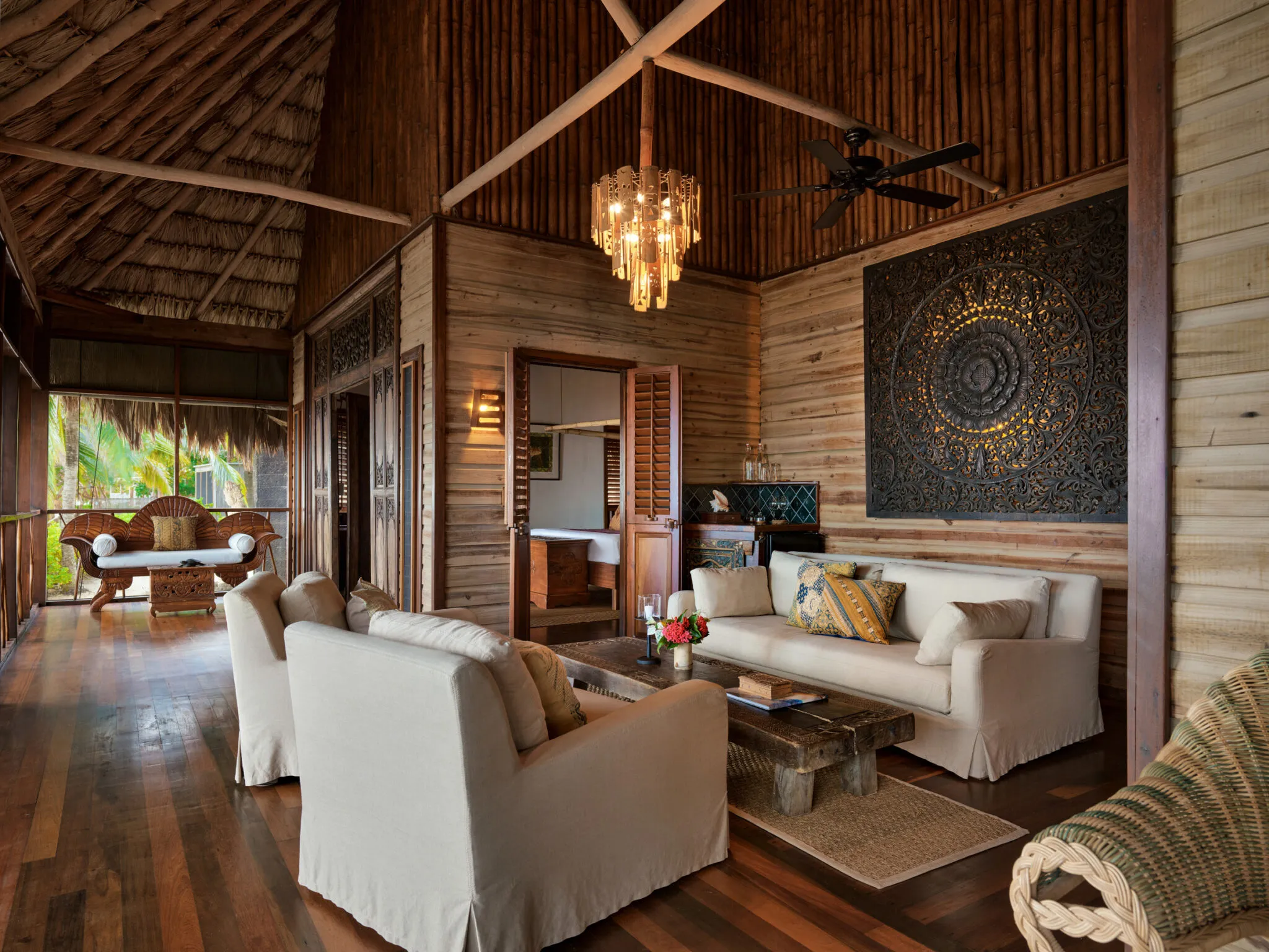 The most desirable villas at our Belize luxury hotel are just a few steps from the Caribbean Sea. These Balinese themed 2-bedroom/2-en-suite bathroom villas provide luxurious proportions with a living room, separate sitting rooms, and an extended screened porch surrounded by a private walled garden with an outdoor shower. Ceiling fans and thatched roofs naturally cool the villas, as do the sea breezes. Turtle Inn prides itself on being one of the leading family hideaways in Belize, even offering a large Balinese-inspired Family Pavilion large enough for the whole family to enjoy. Check it out today.